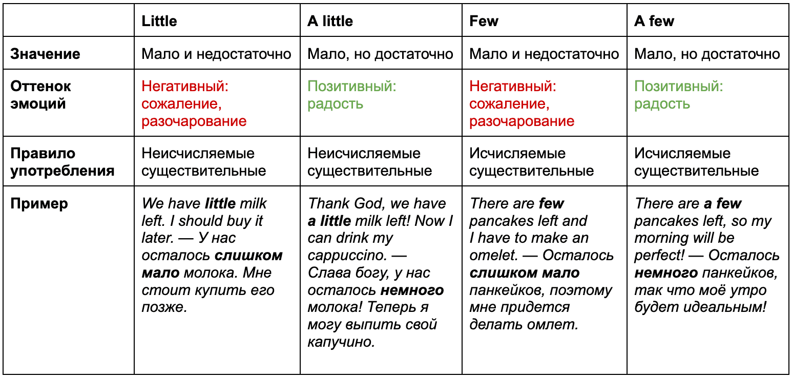 ❗️ Важно: принципиальное отличие “few” от “little” — использование только с исчисляемыми существительными. Панкейки можно посчитать по отдельности — также, как и стулья, дома, самолёты, конфеты и многие другие существительные в английском языке.