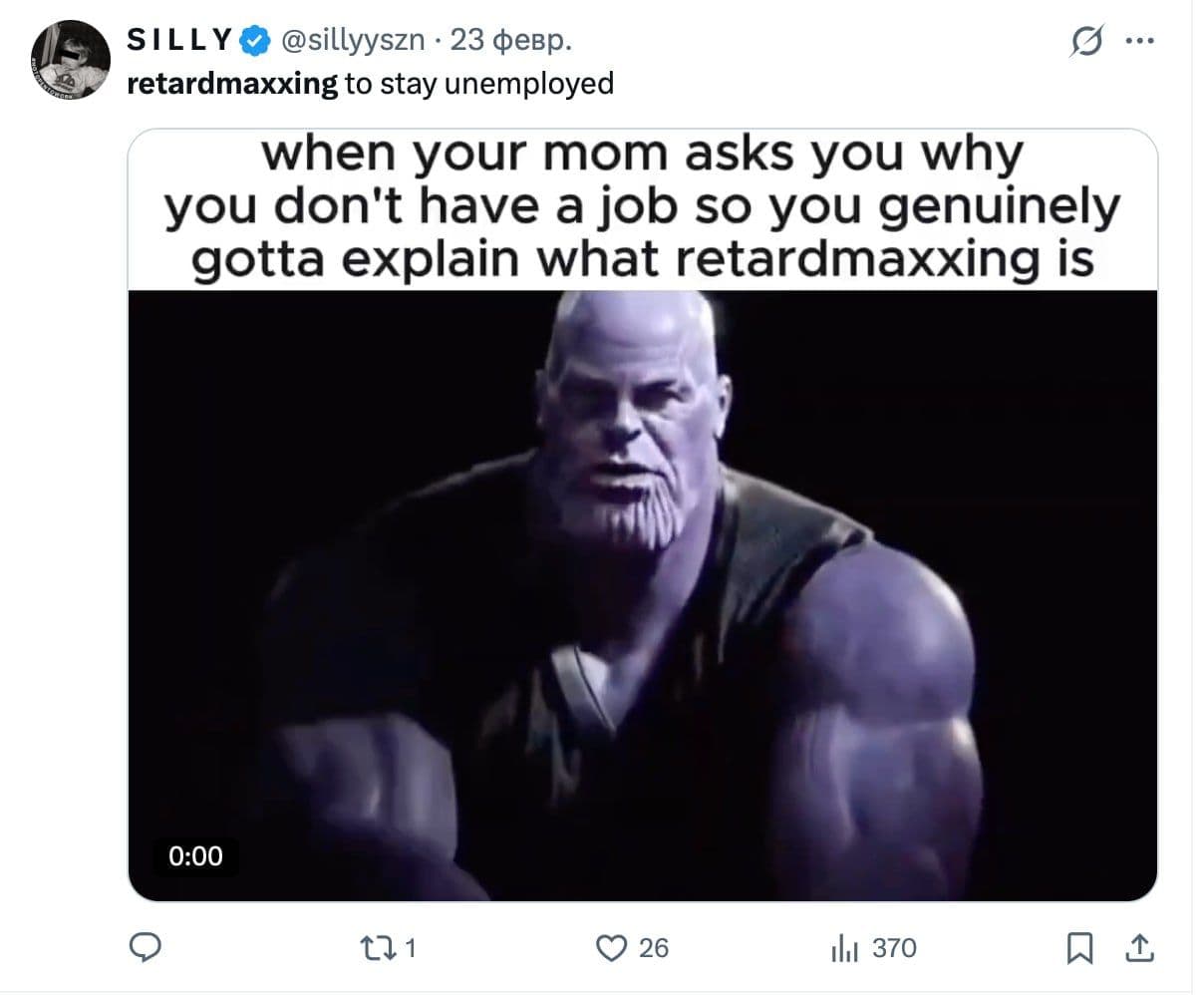 Ещё один представитель brainrot-мемов — слово retardmaxxing (от слов retard — «отсталый» и maxing — «максимизировать»). Помните, в словах 2024 года по версии английских словарей мы писали о слове? А в январе однокоренным популярным словом было jestermaxxing — мы писали об этом здесь.