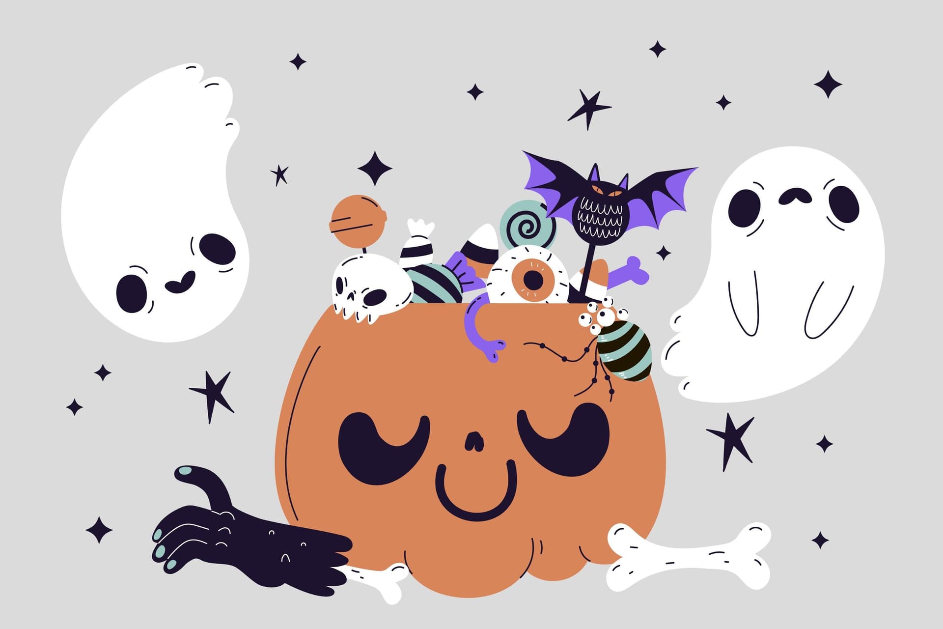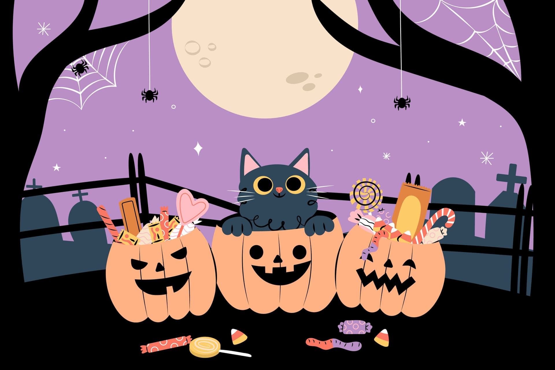 Символы: тыква, чёрный цвет, ведьмы, черти, пауки, летучие мыши.