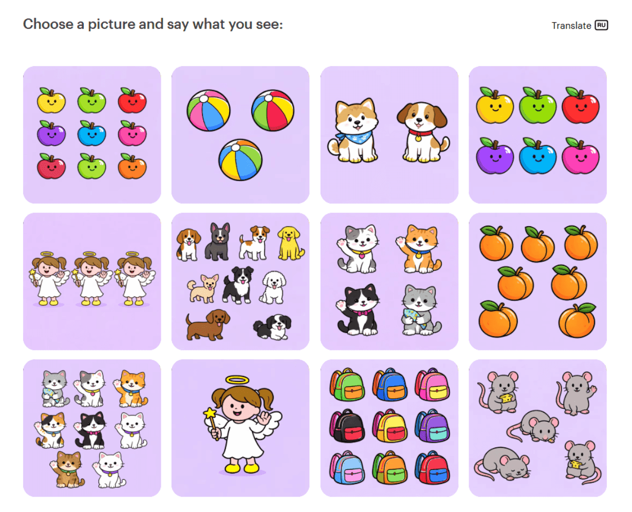 Все материалы на платформе озвучены, поэтому ребёнок с самого начала привыкает к английской речи, учится правильному произношению и развивает навык аудирования. Практика говорения начинается уже на первом занятии: дети повторяют слова и фразы, отвечают на простые вопросы и постепенно начинают говорить самостоятельно. Это помогает преодолеть языковой барьер и почувствовать уверенность в своих силах.