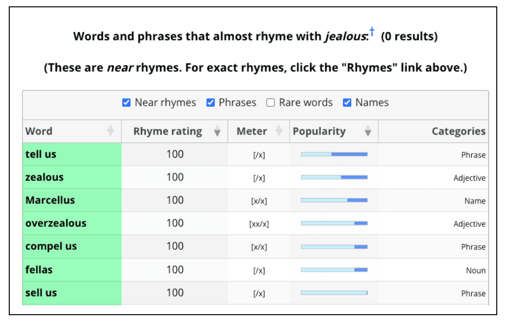 Если вы пишете стихи и песни на английском, вы точно должны знать об этом словаре рифм. Вы вводите слово, а сайт выдаёт вам слова и фразы, которые можно с ним срифмовать. Причём не в случайном порядке, а ранжированными по тому, насколько близка рифма. В фильтрах вы можете выбрать: показывать ли редкие слова, оставить ли в выдаче словосочетания и имена.