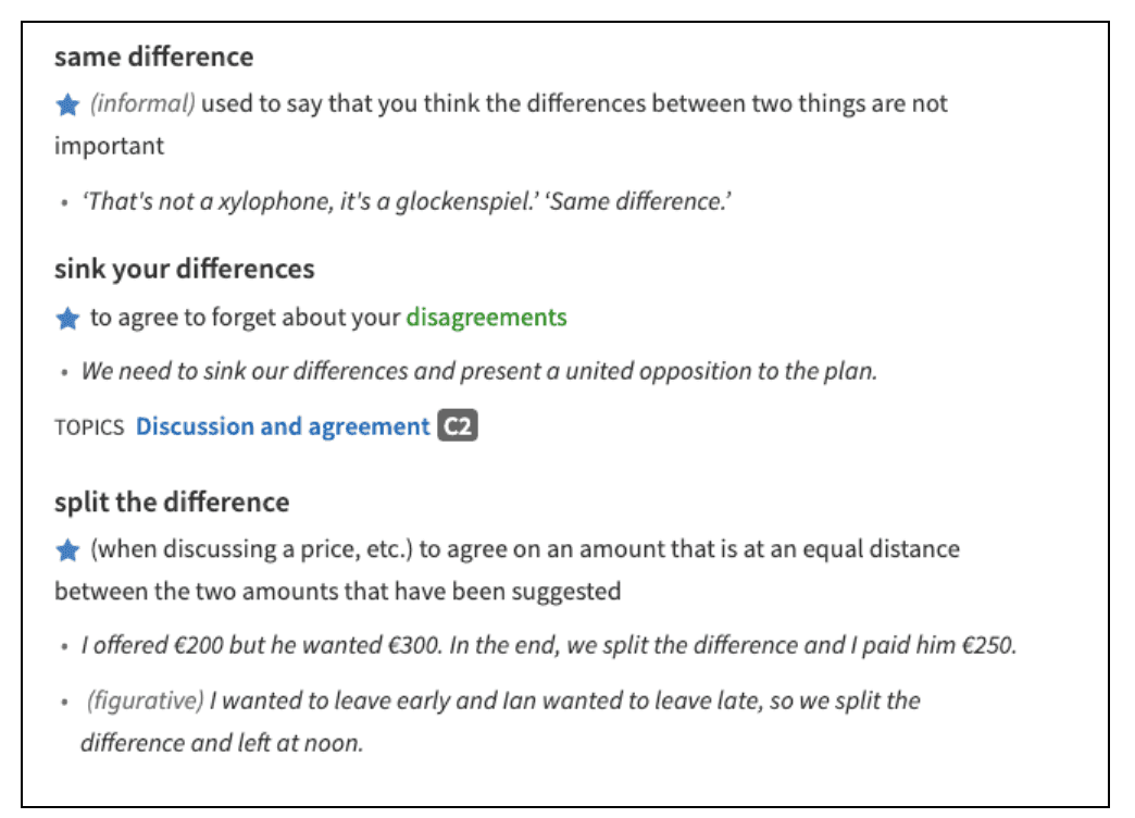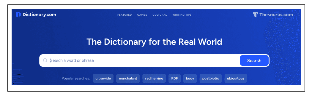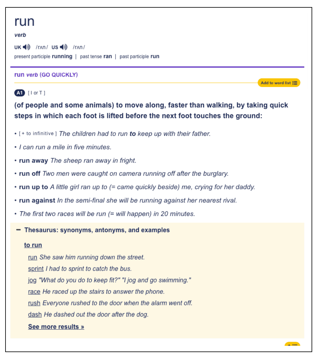 У Cambridge Dictionary нет доступа к Oxford Collocations Dictionary или Оксфордскому этимологическому словарю. Зато здесь более информативный thesaurus — раздел со списком синонимов и антонимов. А ещё на сайте есть ИИ-ассистент, которому можно задать вопросы о лексике и грамматике, а также блог, где можно узнать о новых словах и проголосовать за их включение в словарь.