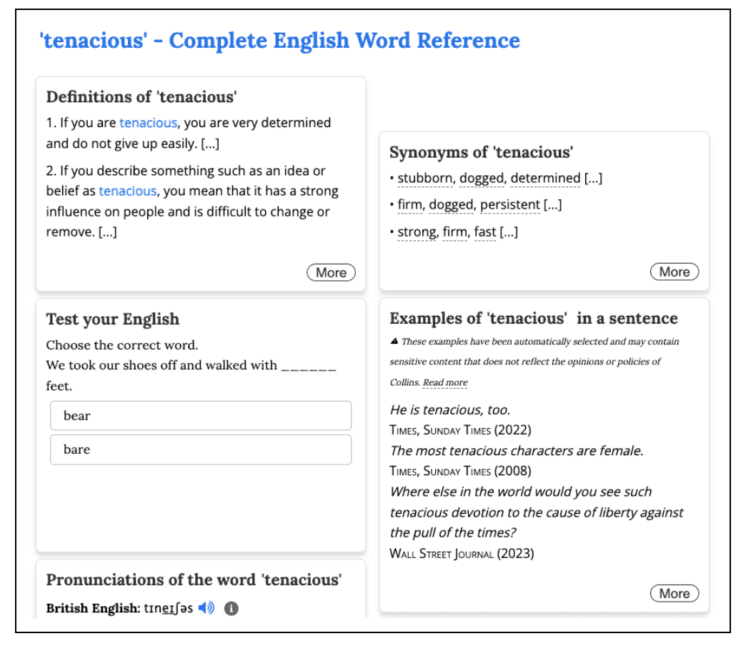 Другой словарь от классического британского университета. Основные функции очень похожи на те, что предлагает Oxford Learner's Dictionaries. Здесь вы также найдёте определения слов, соответствующий уровень языка, произношение, примеры использования.