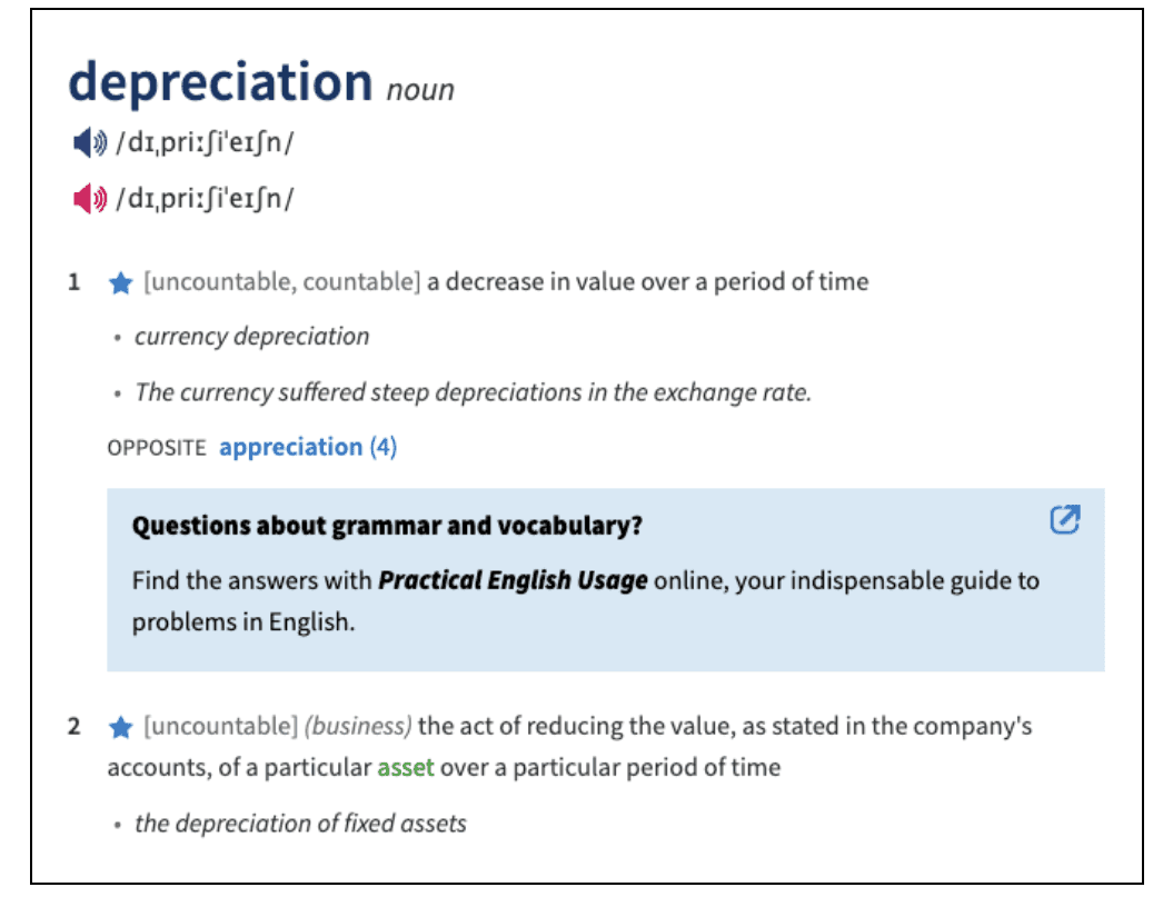 Не для всех слов описание настолько подробное. Например, по запросу depreciation Оксфордский словарь показывает лишь произношение и определение с парой примеров использования.