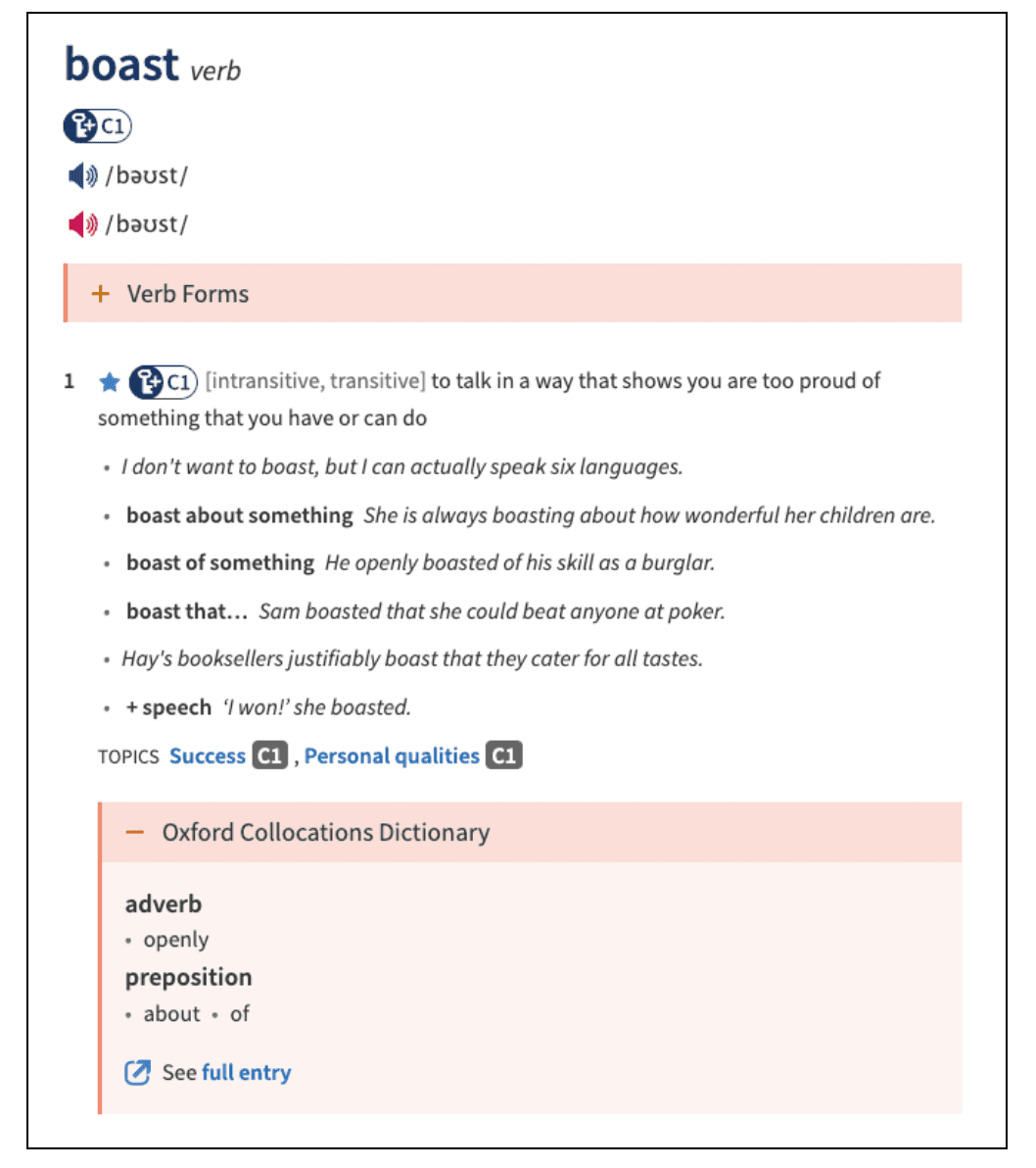 As classic as it gets. На этом сайте объединили несколько онлайн-словарей, разработанных в Оксфорде специально для тех, кто изучает английский как иностранный. Разберёмся, на что он способен, на примере слова boast — хвастаться.